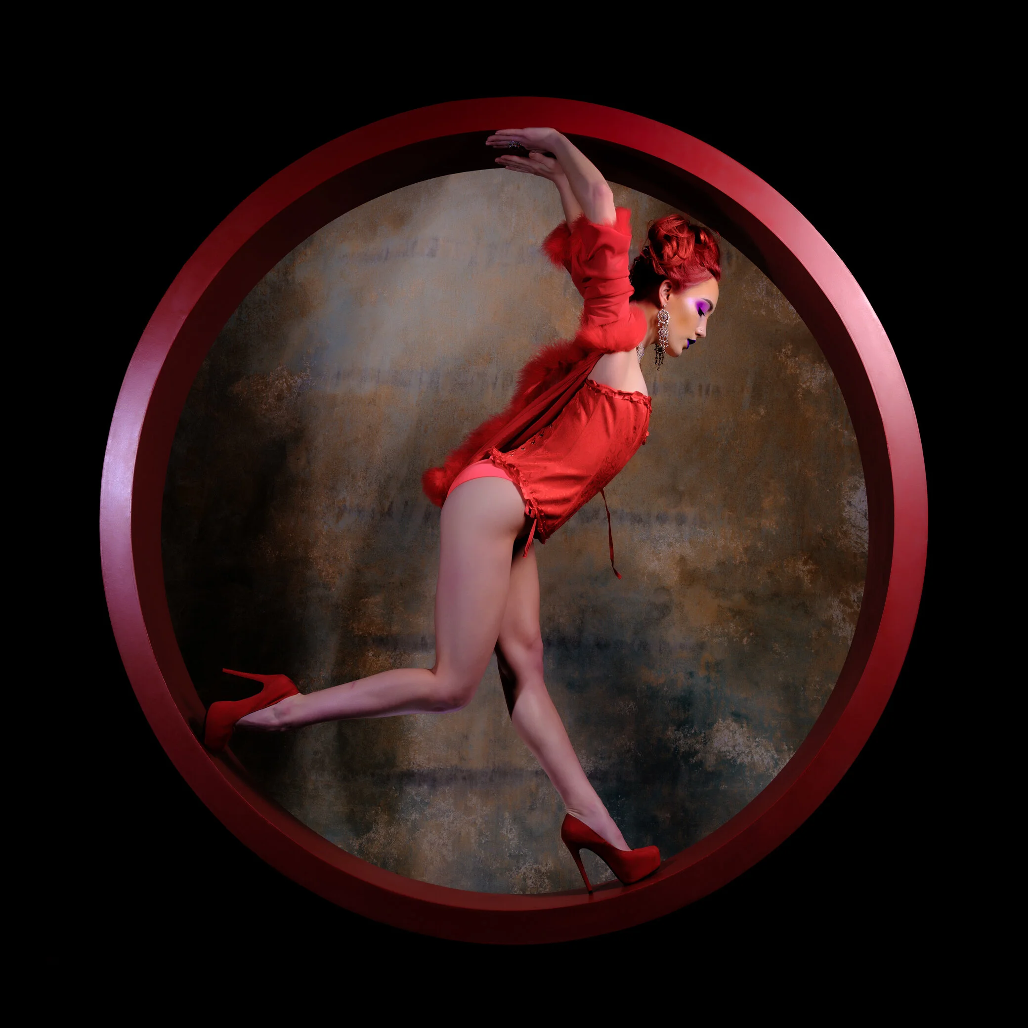 "Shape, light, and form create a marvelous work of art, combined with the female figure, and a decorative background - all within the bounds of a red circle."